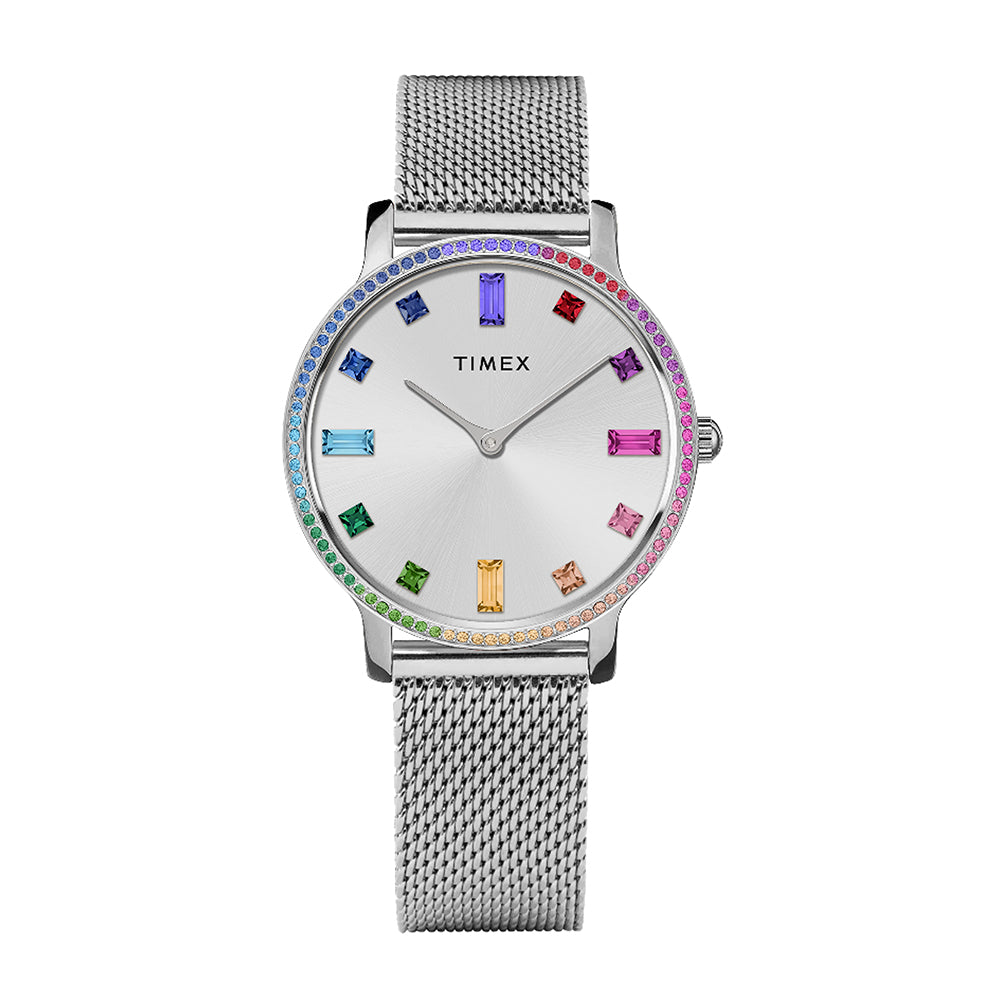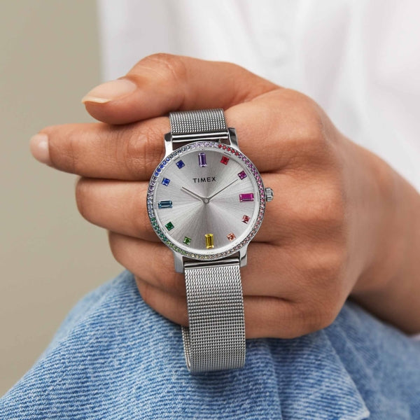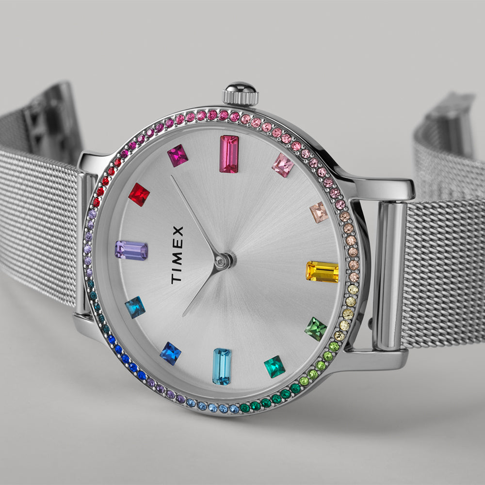 With its elegant sunray dial, dimensional crystal markers, and crystal encrusted bezel, our slim 34mm Transcend? offers a touch of sophistication to your look. The silver-tone stainless-steel mesh band features quick release spring bars and a sliding buckle for easy adjustment, giving you a well-rounded watch with understated style and class.