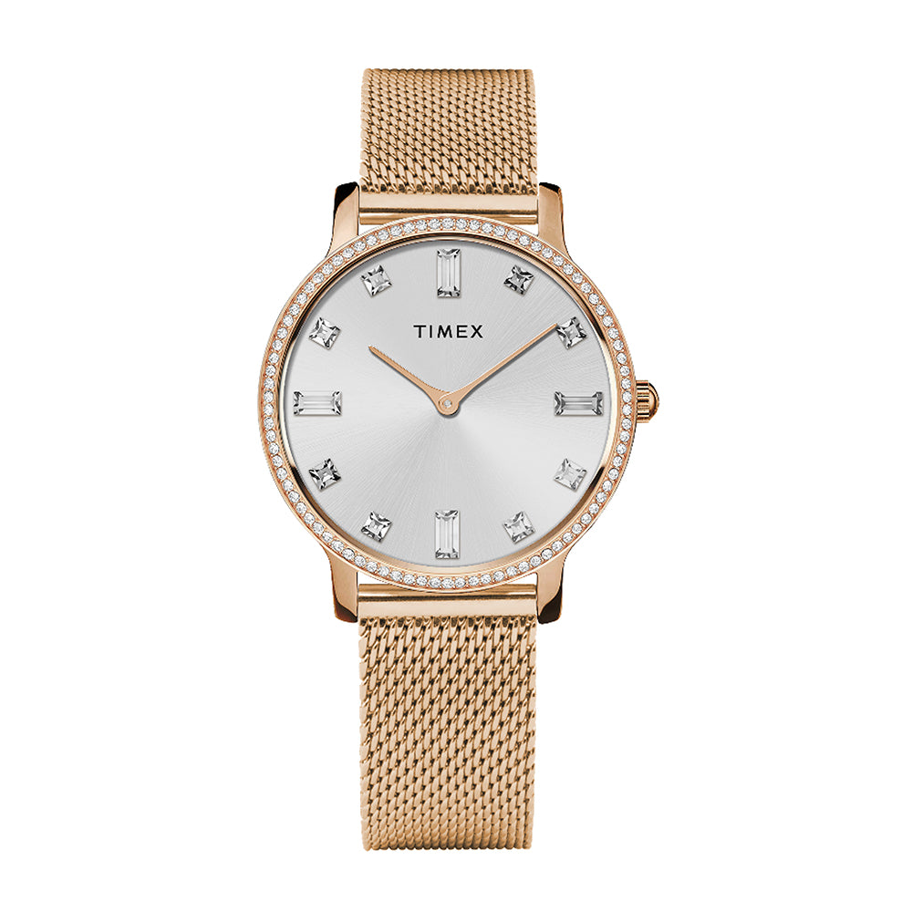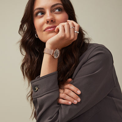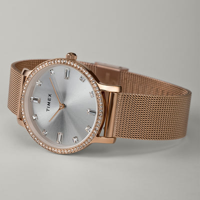 With its elegant sunray dial, dimensional crystal markers, and crystal encrusted bezel, our slim 34mm Transcend? offers a touch of sophistication to your look. The rose gold-tone stainless-steel mesh band features quick release spring bars and a sliding buckle for easy adjustment, giving you a well-rounded watch with understated style and class.