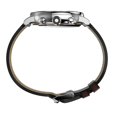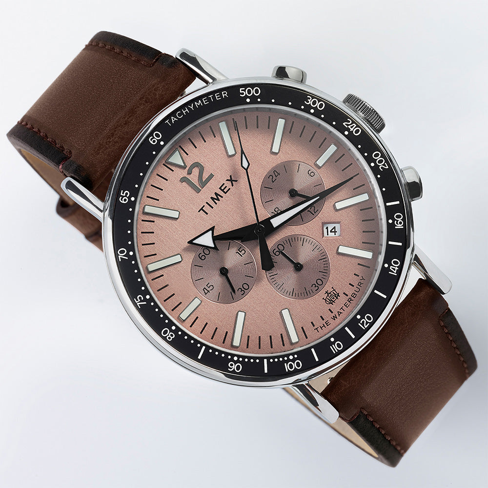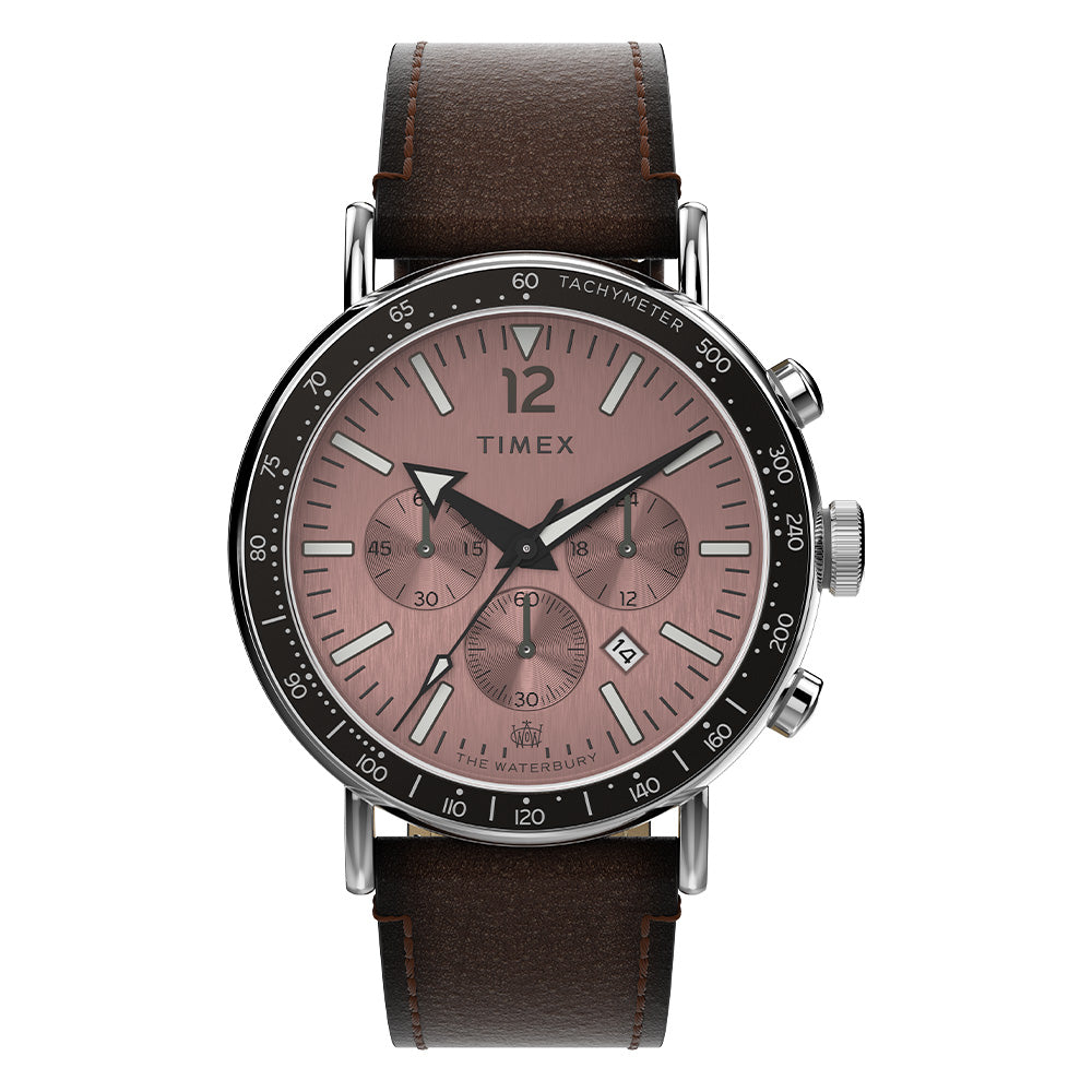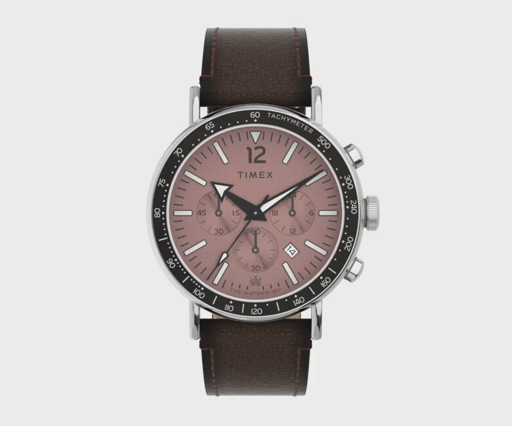 With its careful attention to detail, the Waterbury Standard Tachymeter Chronograph shines as one of our most refined everyday watches. Designed with versatility in mind, it brings together classic elements with modern materials, including a tachymeter index along its top ring to measure speed and distance. The faux leather strap in rich brown with a dégradé finish is derived from corn polymers rather than petroleum-based oils, making it a more sustainable choice compared to natural leather. This watch also features a date window, 100m of water resistance, dimensional applied indices, quick-release spring bars, and a gorgeous salmon dial. It’s a timepiece that keeps you going the distance without ever sacrificing style.