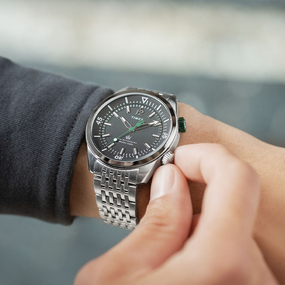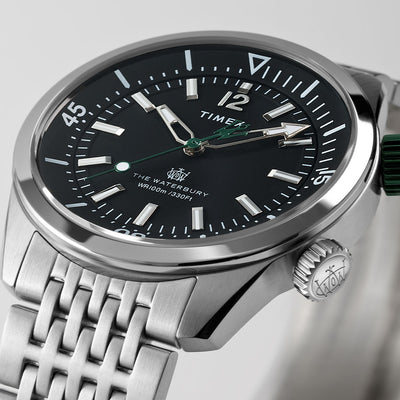 We?ve blended our favorite elements of the Waterbury Traditional case with a dive-inspired design to welcome a new quartz member into the family. Like all Waterbury?s, this timepiece displays our attention to craftsmanship and detail with finely finished surfaces and careful applications of watchmaking ingenuity. In a nod to our original collection, The Waterbury Watch Company logo is featured on the dial and second hand, which bears the stylized W, while the 3-hand date display with its internal turning elapsed time ring has been added to the existing case design. We?ve topped things off with a sophisticated black dial and stainless-steel bracelet that deliver function just as well as form.