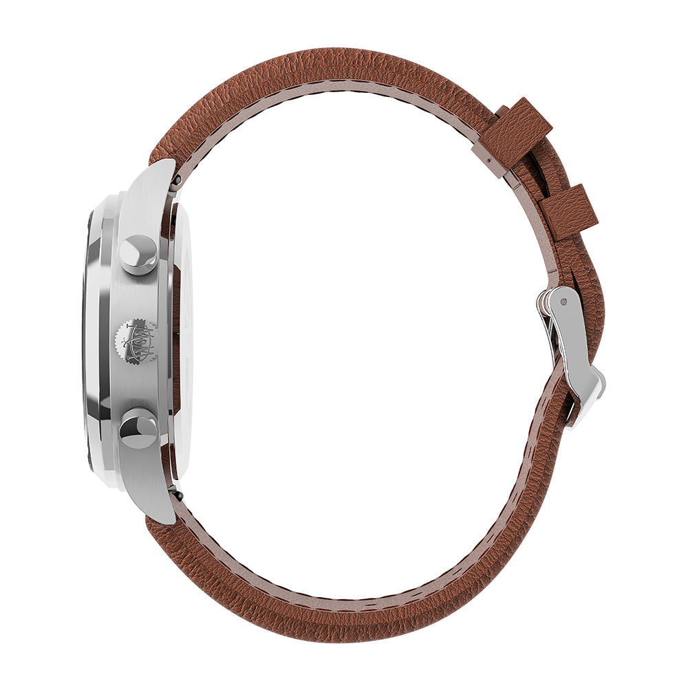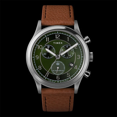 We have looked to our past, and we're paying homage to our original watch collection by using the Waterbury Watch Company logo on the dial, crown and second hand, which bears the stylized W. Each watch displays our attention to craftsmanship and detail, with finely-finished surfaces and careful applications of watchmaking ingenuity. Featuring classic green dial and rich caramel brown leather strap, our Waterbury Traditional Chronograph unites all of these elements into something that delivers function just as well as form. The watch's dial has three sub-dials — chronograph minutes and hours, as well as running seconds — laid out in brushed inner circle to provide depth and detail, and it also features an ever-practical date display window situated at four o'clock.