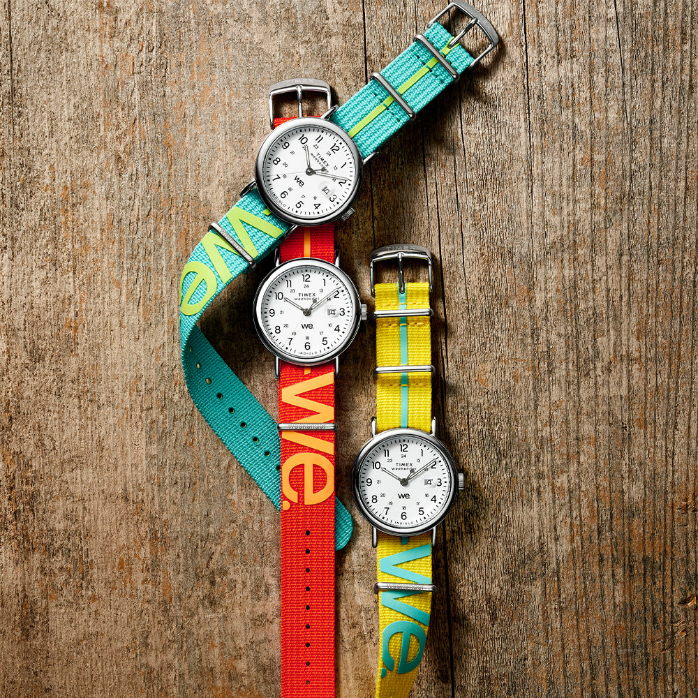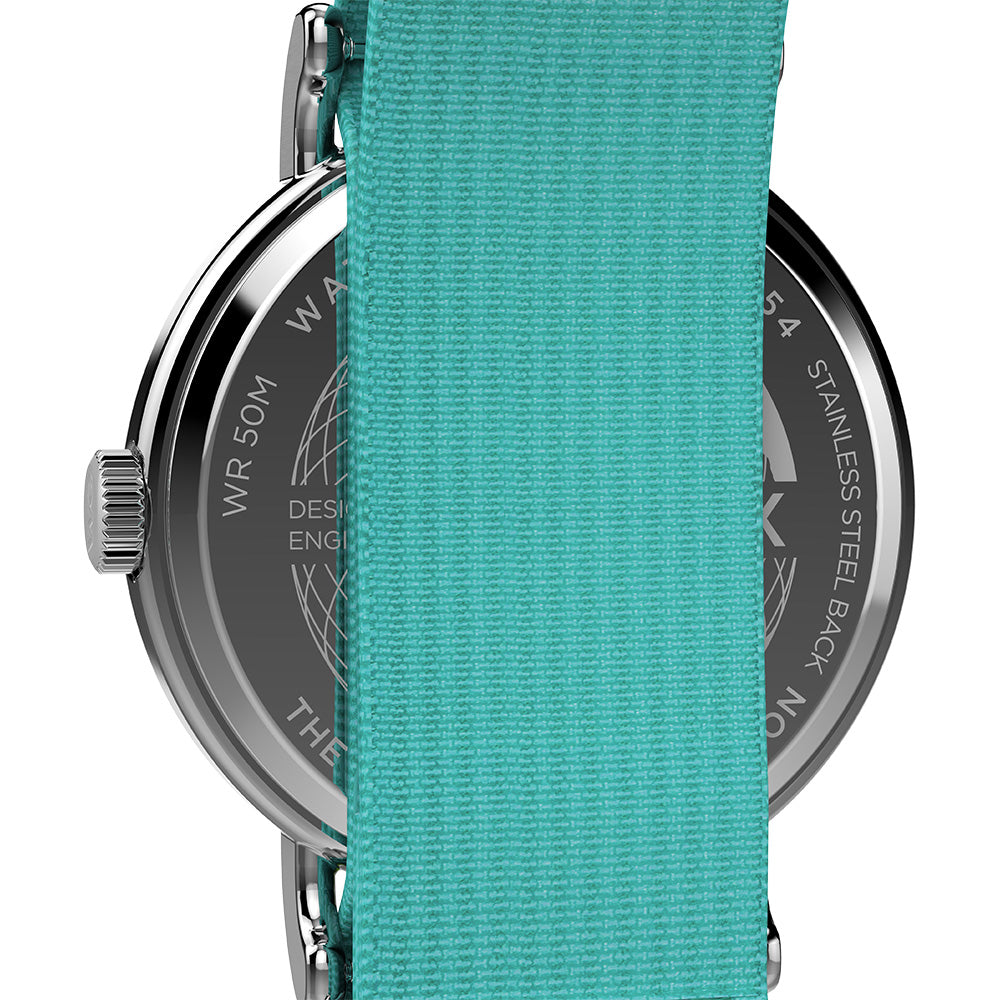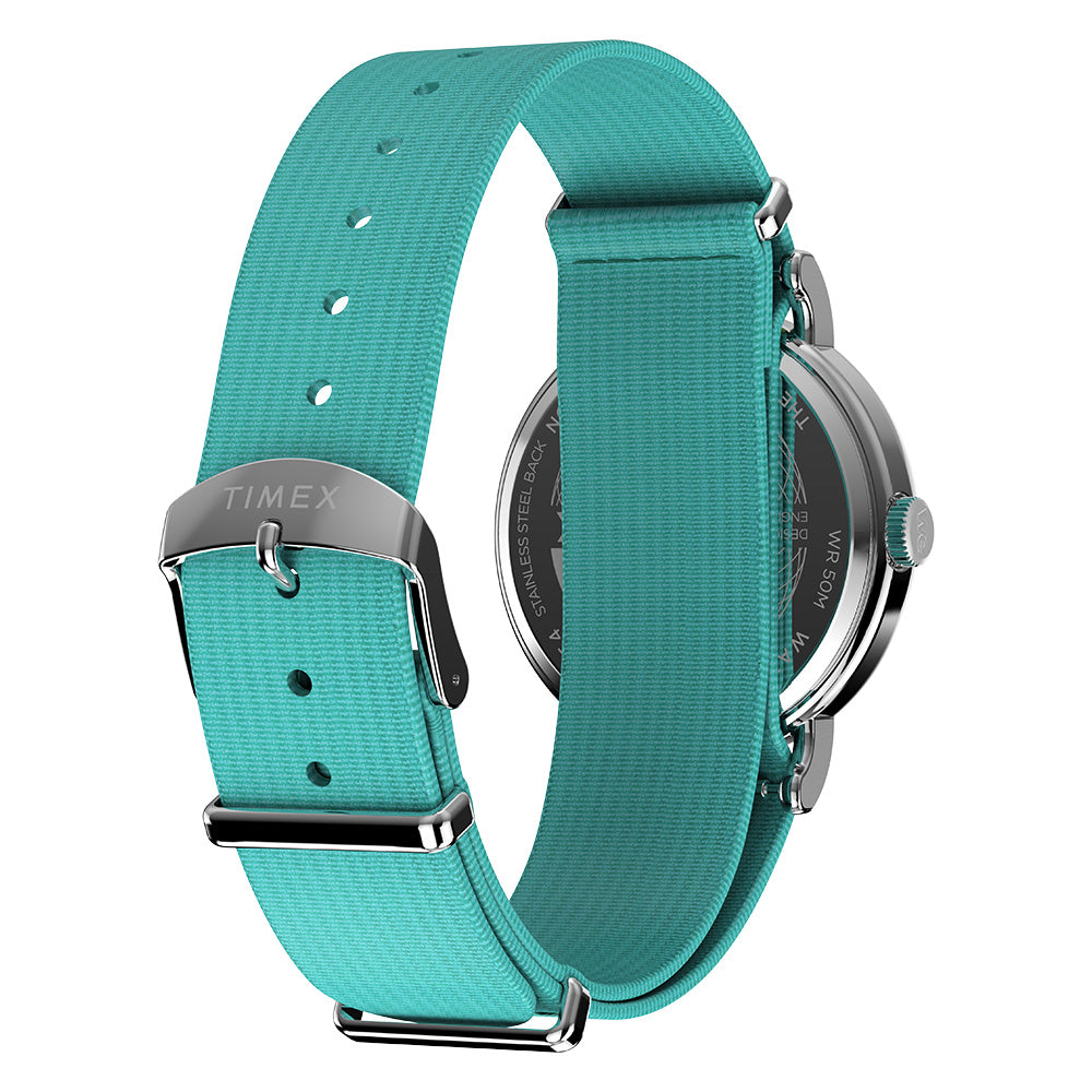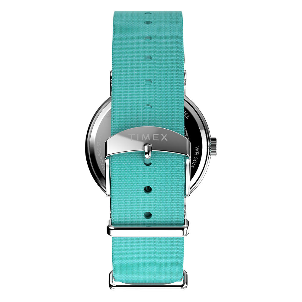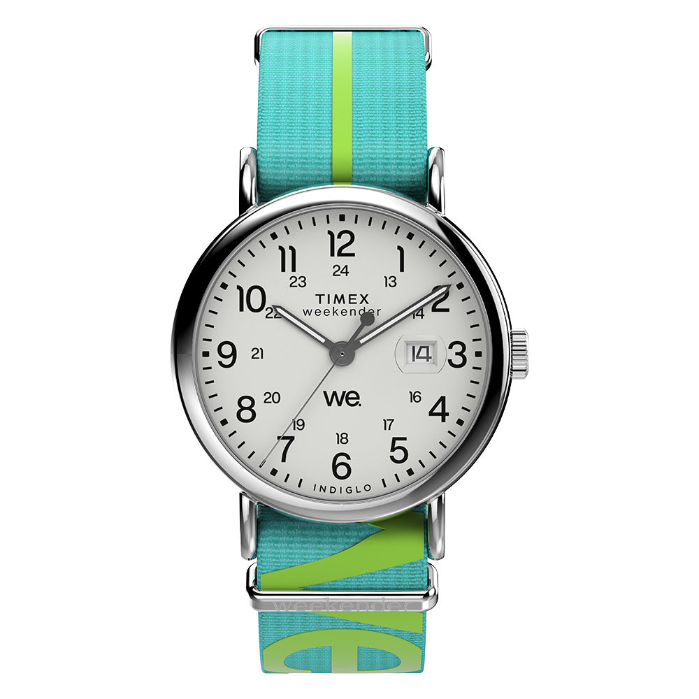 We’re bringing a fresh burst of energy to our beloved Weekender with elevated details, like a sleek new 40mm case, a new crown design, and an eco-friendly fabric strap branded with the iconic “we.” logo. The strap appears in a bright colorway and features a slip-thru design that makes it easy to swap it out for one in another color or print. This everyday watch is equipped with luminous hands and our INDIGLO® backlight, and on the white dial, you’ll find a date window complete with a magnifier for enhanced viewing, both 12- and 24-hour time indexes, and the Timex Weekender “we.” logo once again as a reminder that any boring old day can become unforgettable if it’s spent with our favorite people.