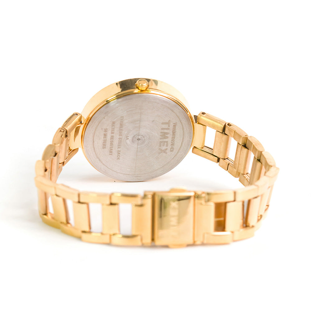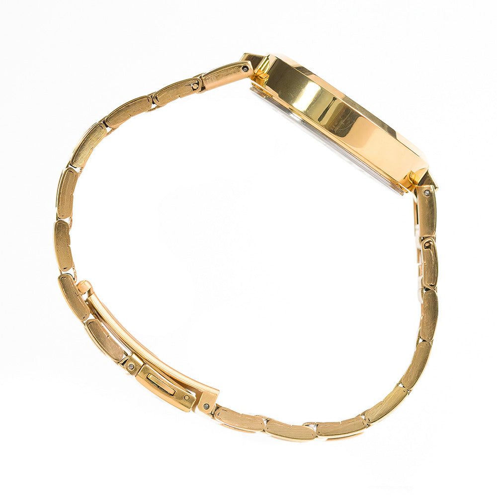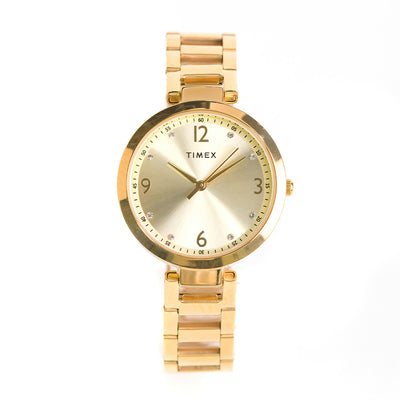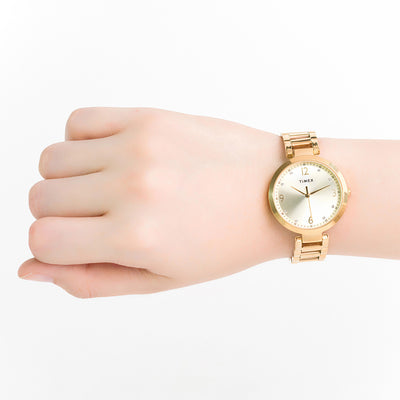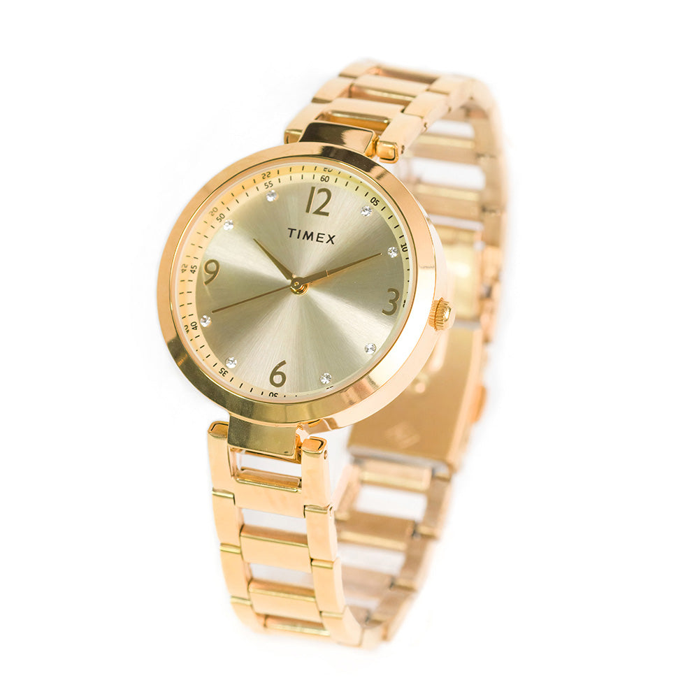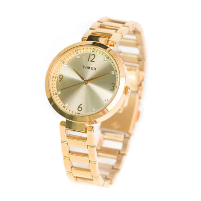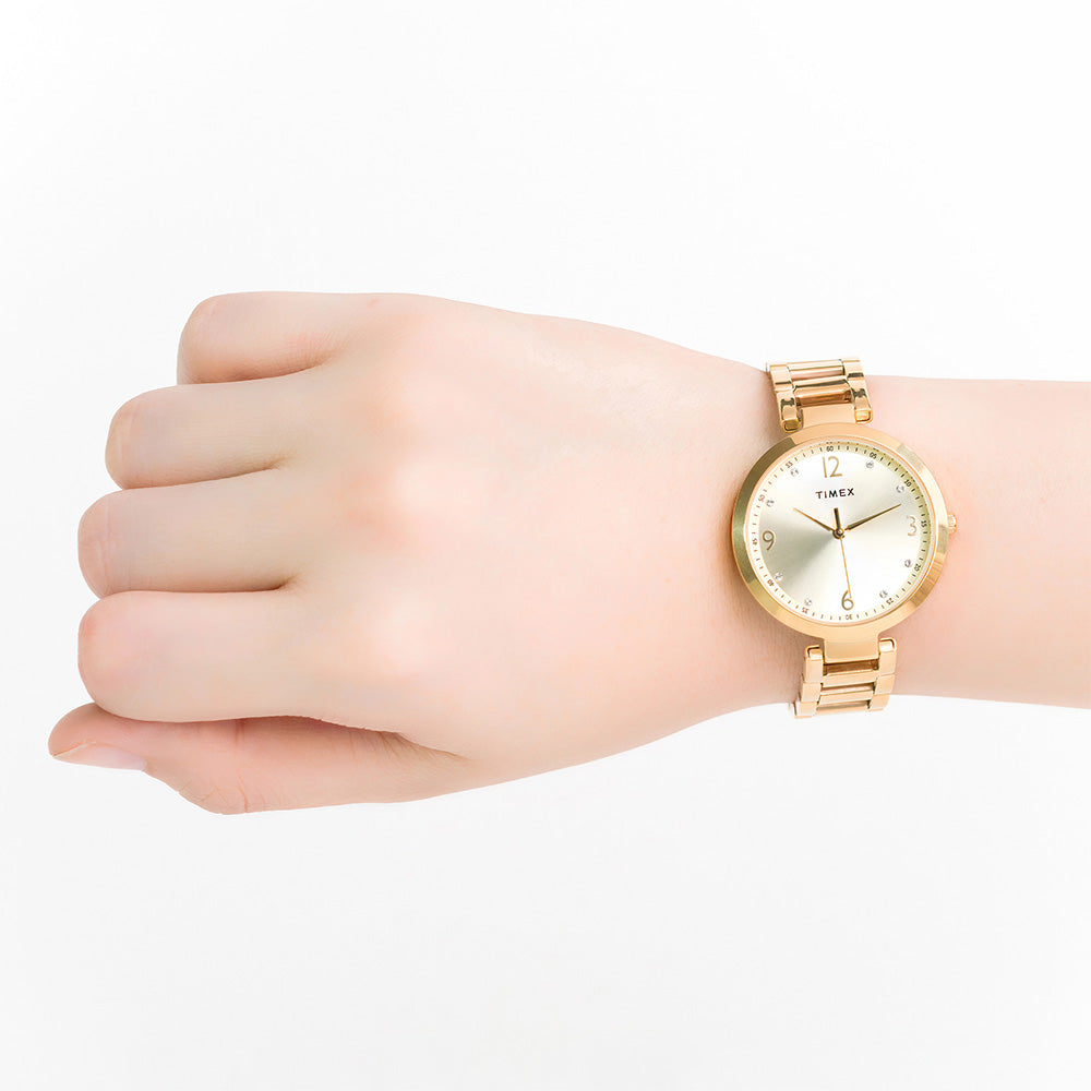 This fashionable analog watch for ladies features yellow gold accent case and stainless steel bracelet. the chic design of the yellow gold dial donned with stones and arabic as markers provides a trendy display of the time. over-all, the stunning gold accents creates a perfect balance of elegance and simplicity, that will help exude confidence to every woman wearing it.