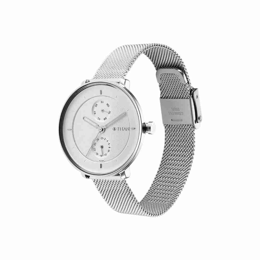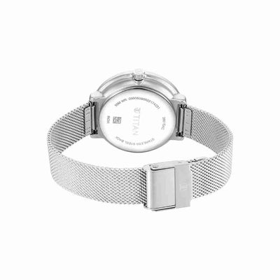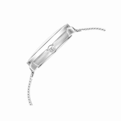 This silver-colored watch with a sandblasted display has a 35mm silver plated mesh strap stainless teel-plated brass case, 10mm thickness, P3H+ date capability, and 5 ATM water resistant.