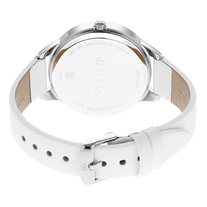 This quintessential piece is tied together with an ombre dial to illustrate the calm, soothing and joyful aura. This white coloured watch with purple dial ties together a steel plated brass case of 36mm size and 8mm thickness with a slight bedazzle of four swarovski crystals, P3H functionality and 5 ATM water resistance. Skeletal hands, an ombre shaded dial and genuine leather of supreme quality brings out the essence of simplicity and minimalism in fashion. Pastel Dreams leaving a sense of tranquillity and happiness, is what one desires today.