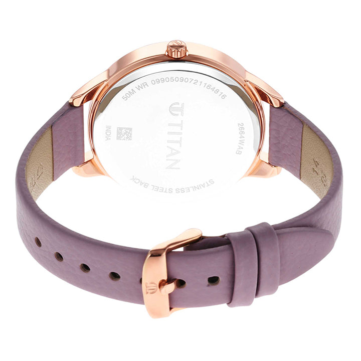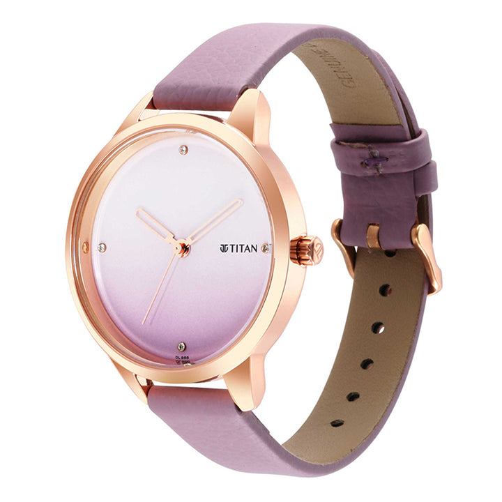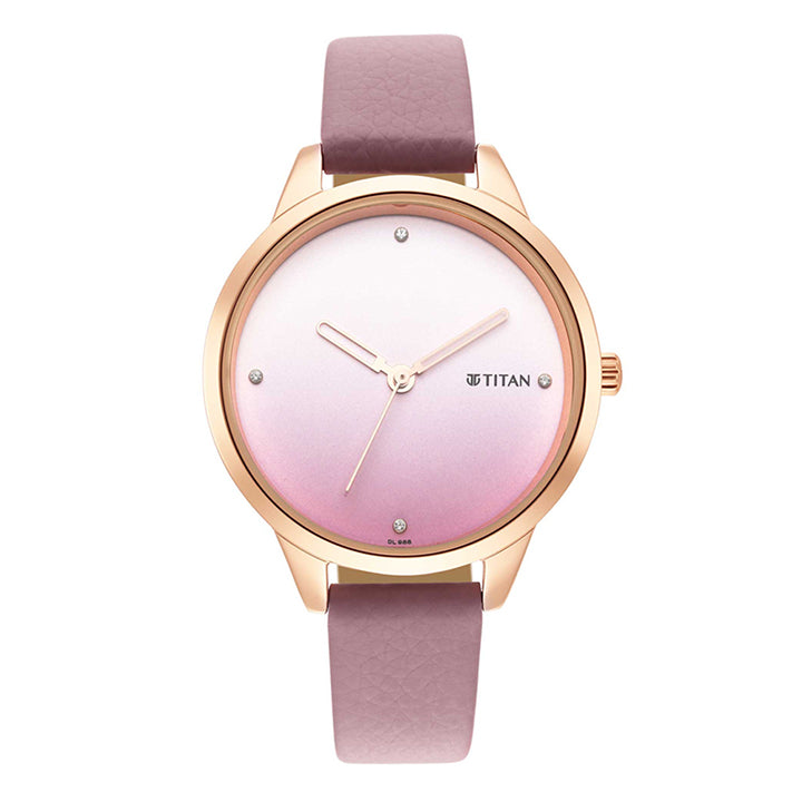 This quintessential piece is tied together with an ombre dial to illustrate the calm, soothing and joyful aura. This misty violet coloured watch with purple dial ties together a rose gold plated brass case of 36mm size and 8mm thickness with a slight bedazzle of four swarovski crystals, P3H functionality and 5 ATM water resistance. Skeletal hands, an ombre shaded dial and genuine leather of supreme quality brings out the essence of simplicity and minimalism in fashion. Pastel Dreams leaving a sense of tranquillity and happiness, is what one desires today.