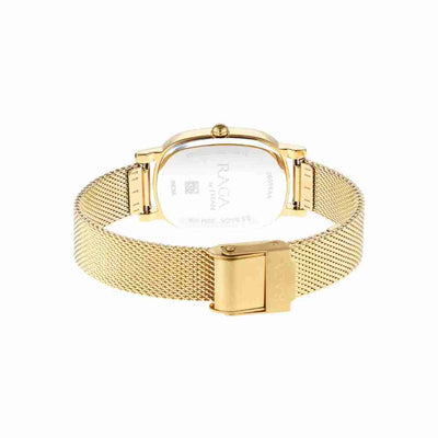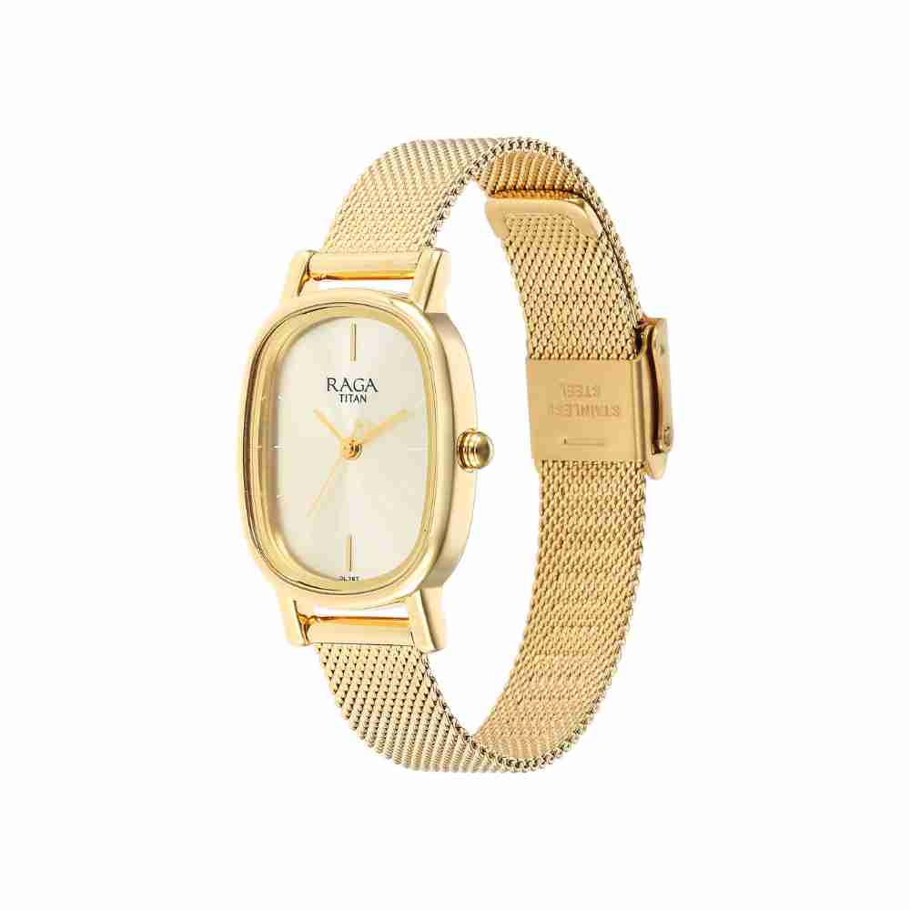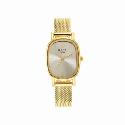 This Titan Raga analog watch for women is the peak of refined style. The golden mesh strap of the watch adds a lovely touch. It features a straightforward design with three hands and a crown for setting the time. It is also completed with a hook buckle clasp to ensure that it stays on you' wrist.