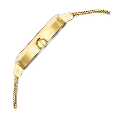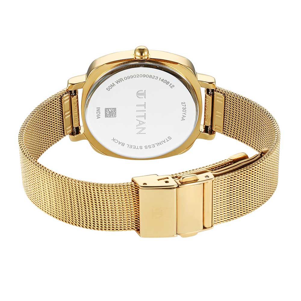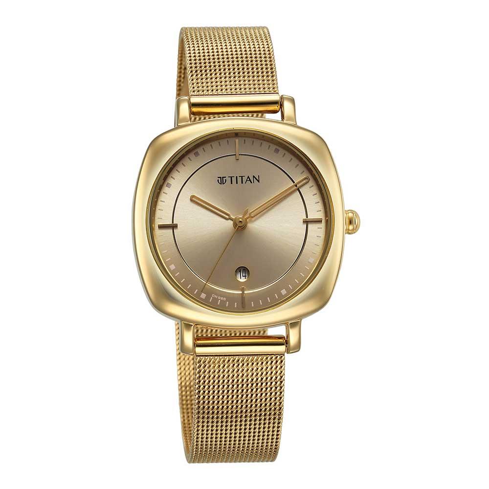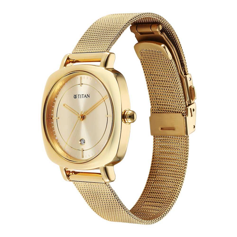 The elegance of a gold watch comes through this timepiece from the Titan Shaped Cases range. ?With a cap folded stainless steel mesh-strap bracelet, this watch also has a 7.05 mm thick case, skeleton hands and a date function.?