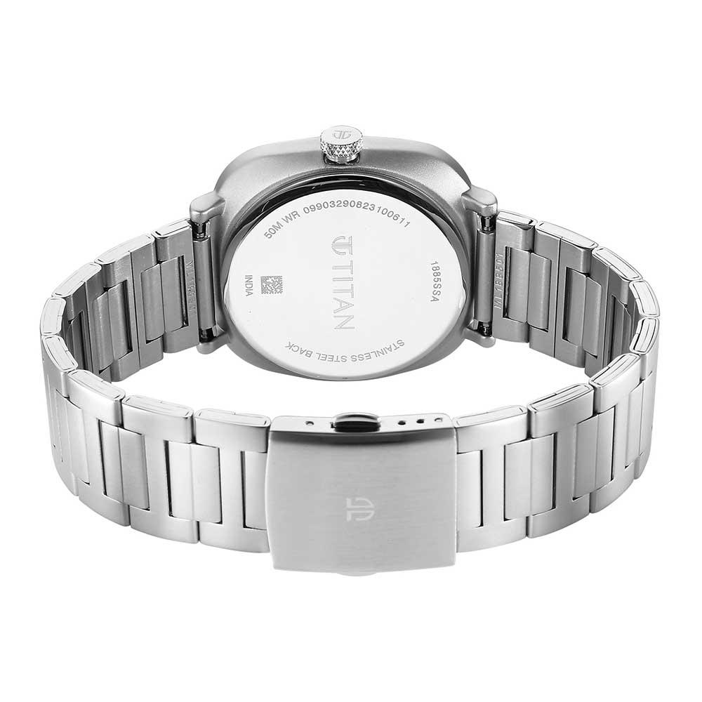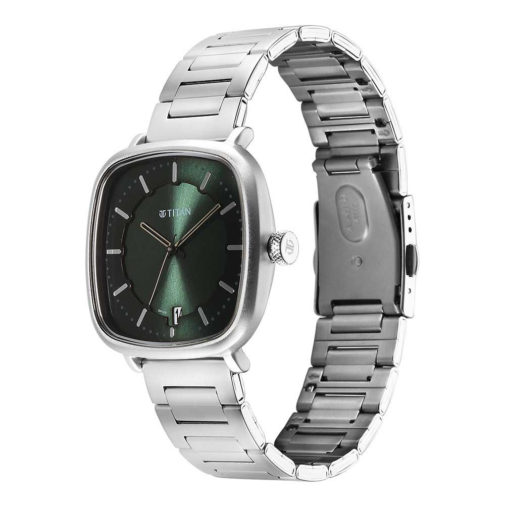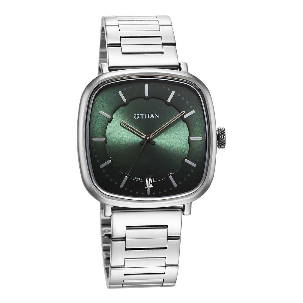 A stylish hue of silver and an enigmatic green come together for this watch from Titan Shaped Cases range with its multi-layered dial 9.20mm thick case, a big date window, and skeleton hands. It is a great way to refresh your look.