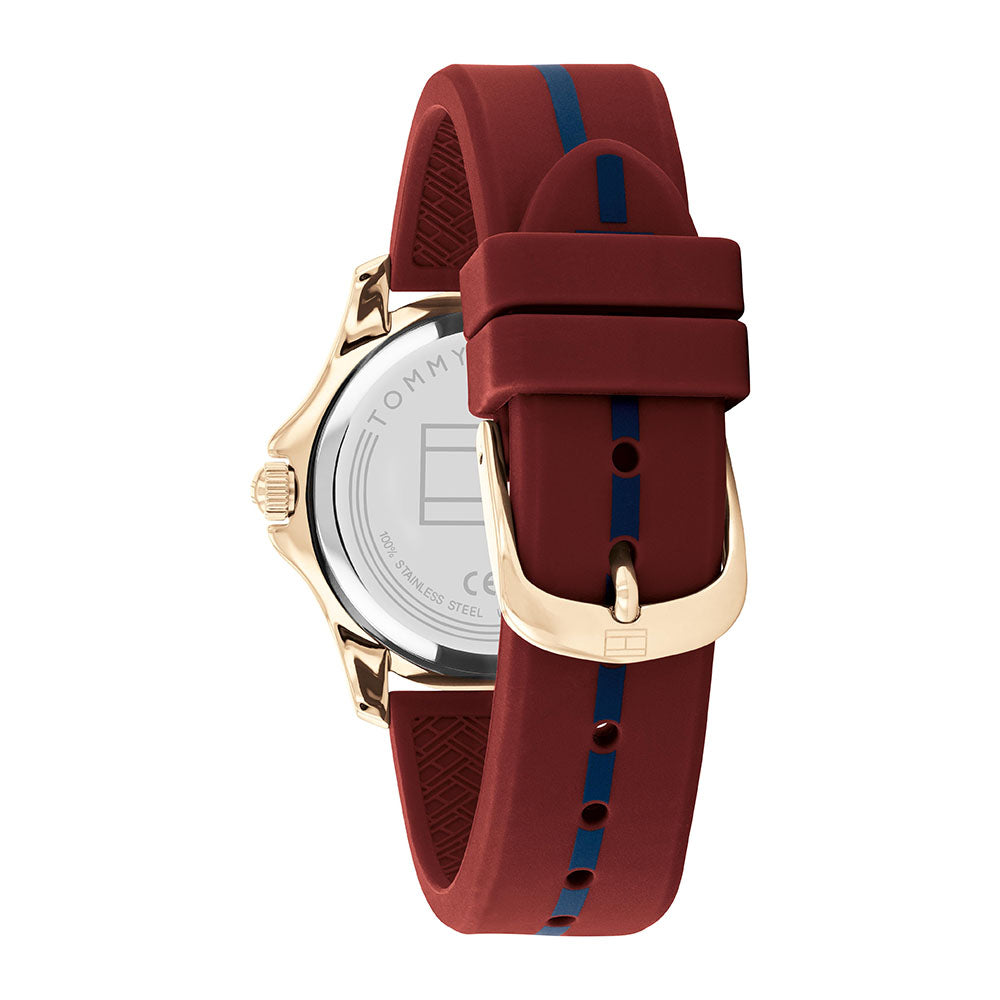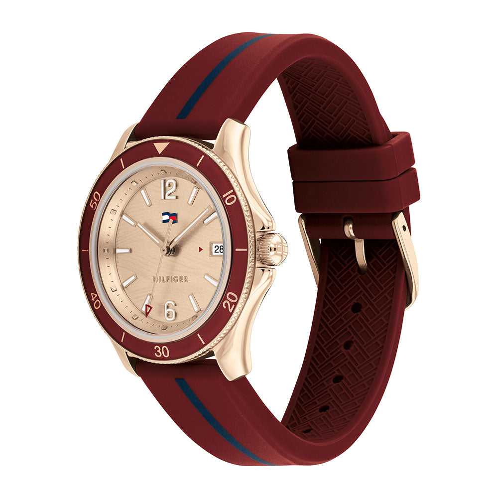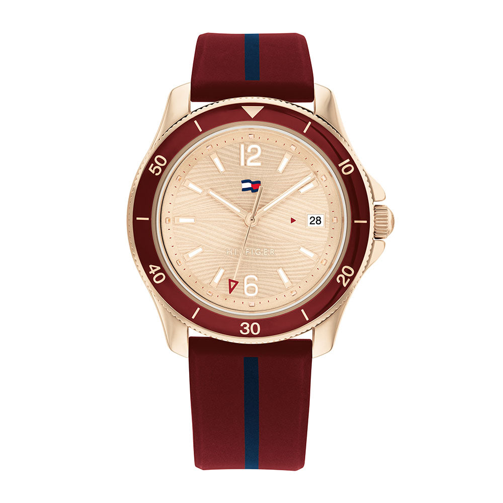 Tommy women's watch in the DIVER tradition. The elegant wave textured dial brings a fun nautical element perfect for the Summer. New wave TH Flag with date window on link Bracelets, Silicone & Sustainable Straps. 3H, 36MM