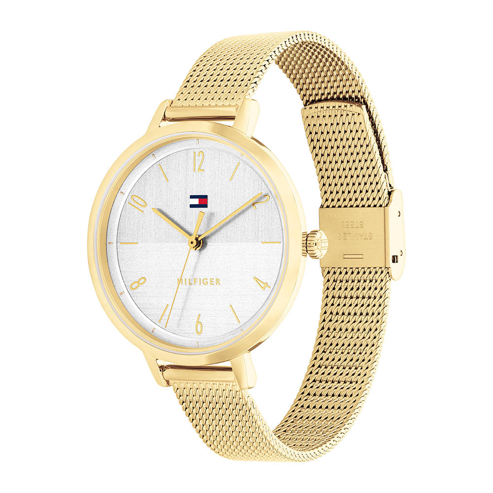 Tommy Hilfiger women's watch. A chic addition to any look, this 38 MM case plays on proportions and ensures that you will always be on time. Mesh bracelets and leather straps. 3H, 38 MM