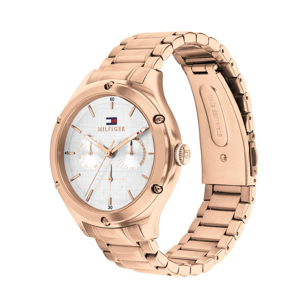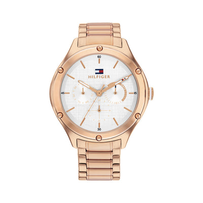 Be bold, be on time. This sport lux watch for her features multifunction movement with woven textured dial and screw details on bezel. Versatile style on Link bracelets and mesh bracelets with full set crystal bezel. Multi-function, 40MM