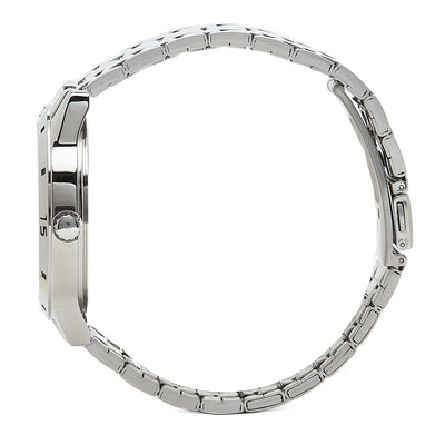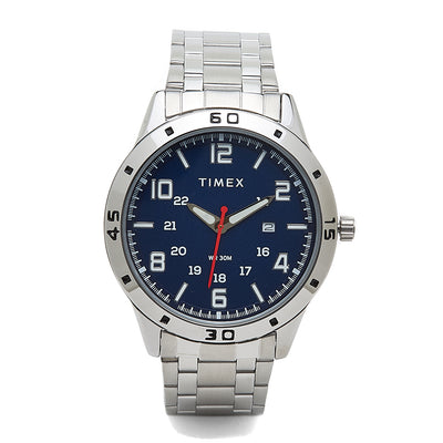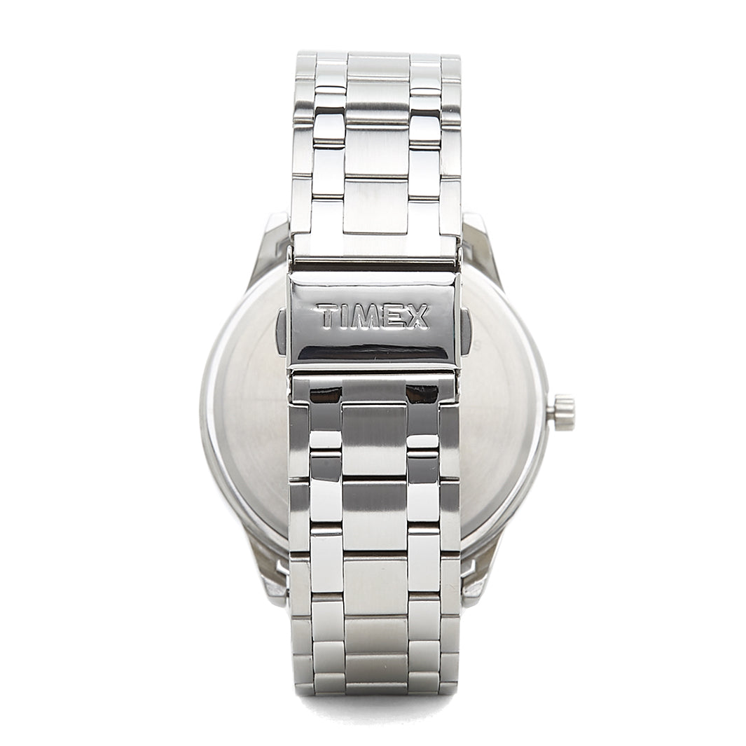 Understated Timex watch in stainless steel, set around a high-visibility dial with large silver numeral hour markers and date functions.