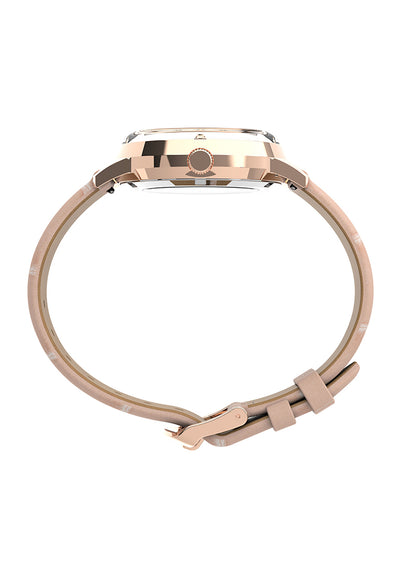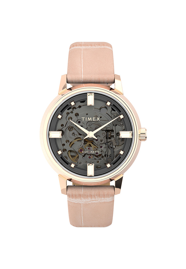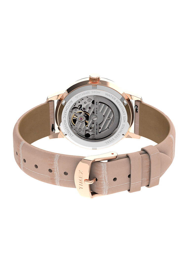 We’re revealing the details behind this automatic collection. A stunning translucent dial and dimensional applied indices with crystal accents make for a watch with impressive depth on the wrist. An exhibition case back creates further depth, even from above, and shows off the movement on full display. Powered by your motion, the 21 jewel movement has a 40-hour power reserve and can also be hand-wound with the crown. This watch is completed with a polished rose gold-tone case and pink soft croco-pattern natural leather strap.