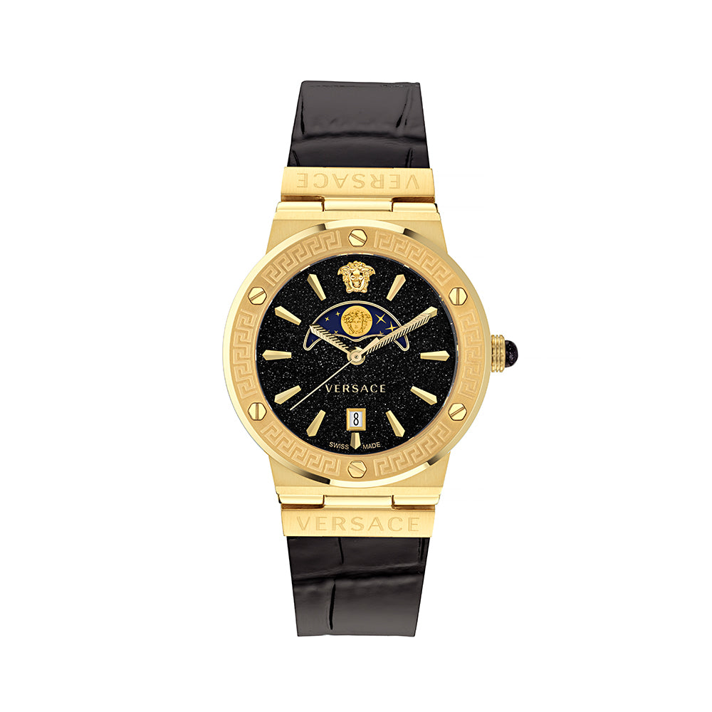 A contemporary timepiece combining geometric shapes and feminine style, Greca Logo Moonphase features round-shaped case that stands in contrast with the rectangular bracelet links. The top ring is marked by the screws and the Greca motif, which gives an immediate recognition of the Brand reinforced by the Versace logo at 6 o?clock and the Medusa head at 12h. The moonphase window is visbile in the upper part of the dial, featuring all the phase of the moon in a very elegant and chic way.In the bracelet version, the timepiece's sleek design is completed by the Versace logo alternately repeated on the links.