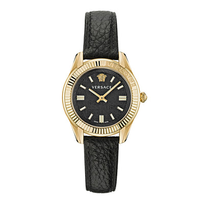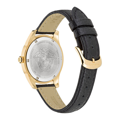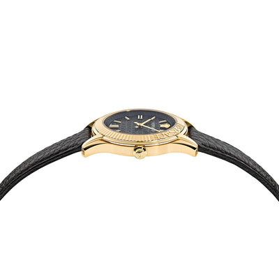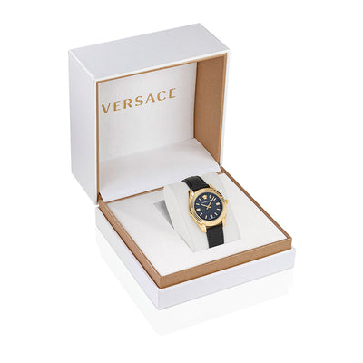 This timeless case body features a sleek dial enriched with Versace la Greca pattern and a 3D Medusa at 12H. The particular finishing of the top ring gives to this watch a glamourous look & feel enriched with Versace logo at 12H. The 35mm case is enriched with a 3 hands movement.