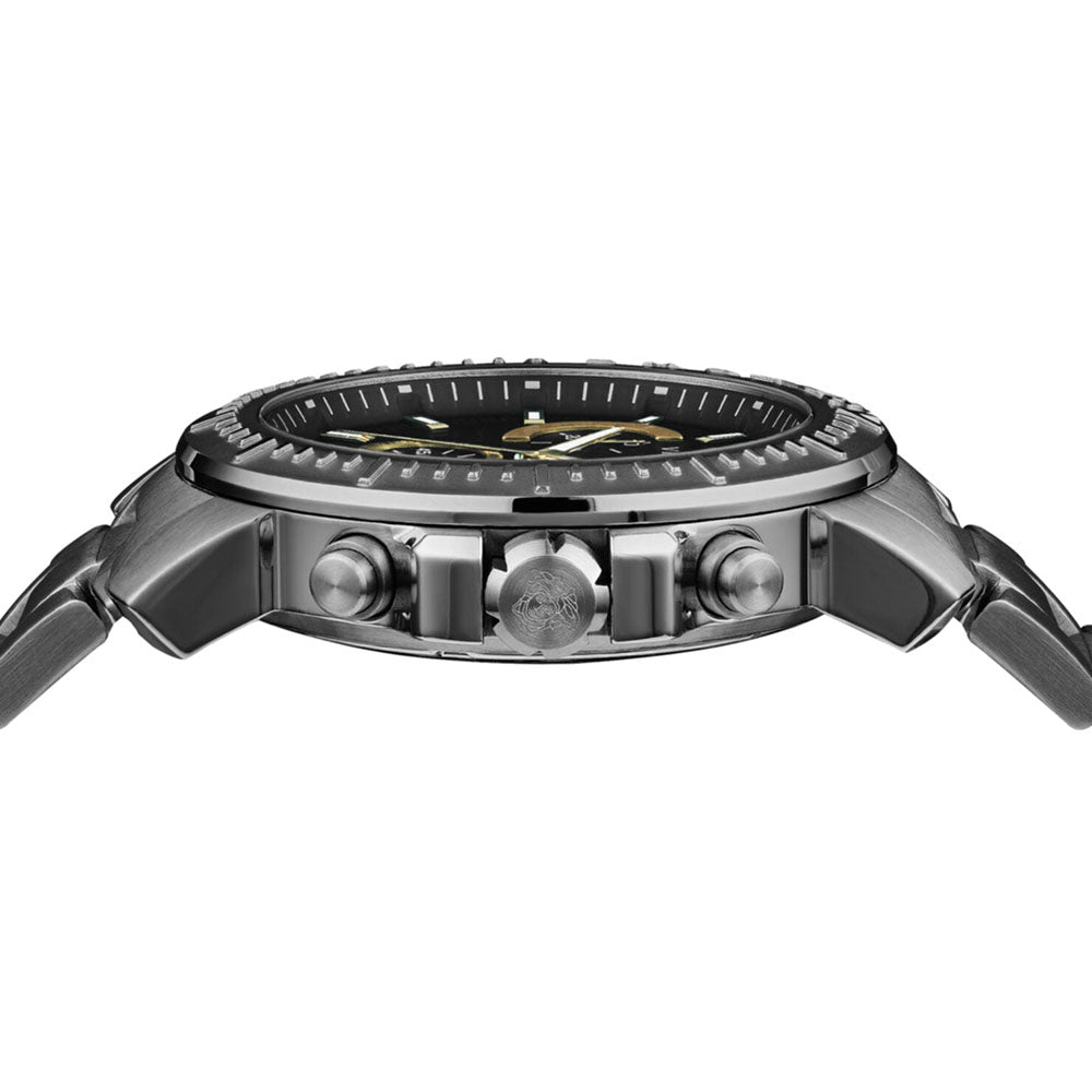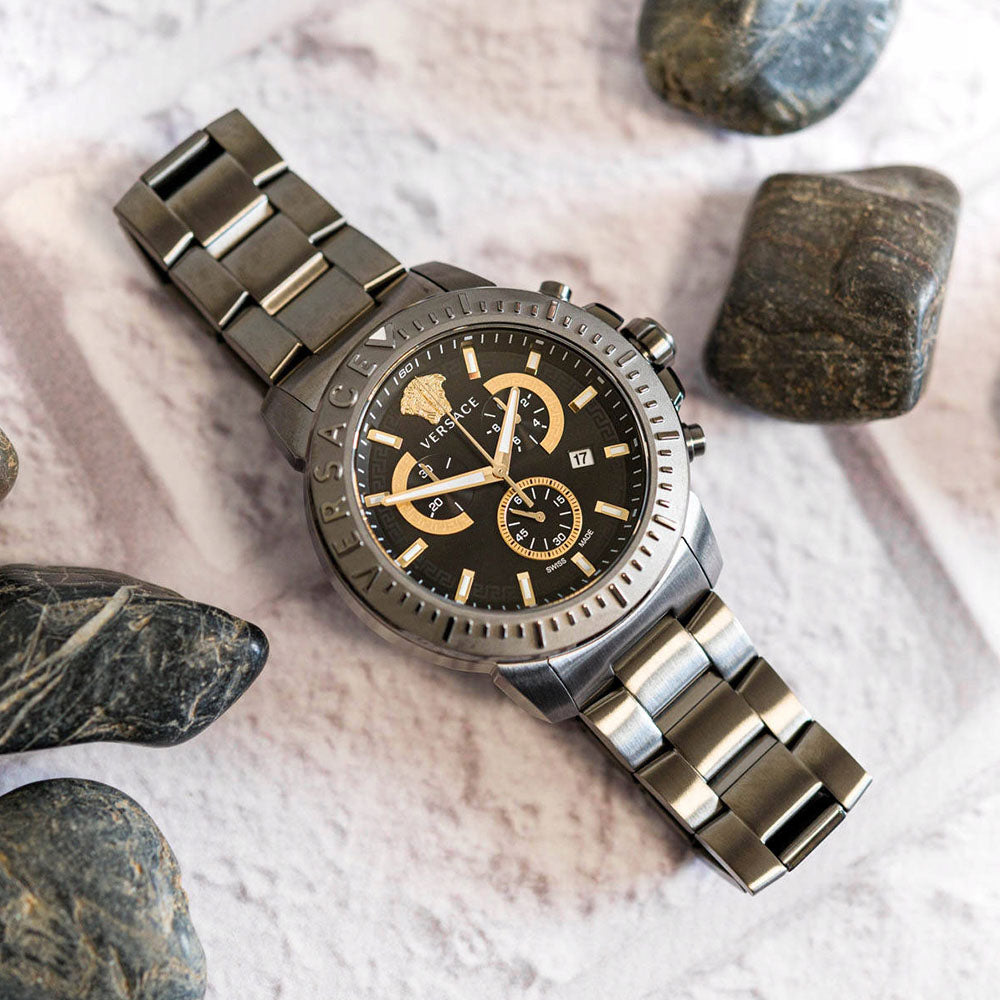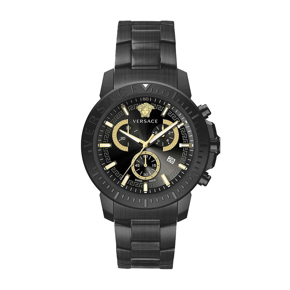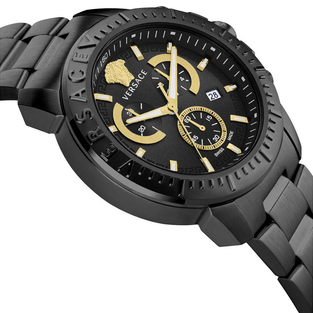 New chrono is an iconic and bold watch that rediscovers the beauty and charm of the versace brand dna. the 45mm case features a sunray dial with a 3d medusa at 12h and greca detailing around the inner dial and subdials.