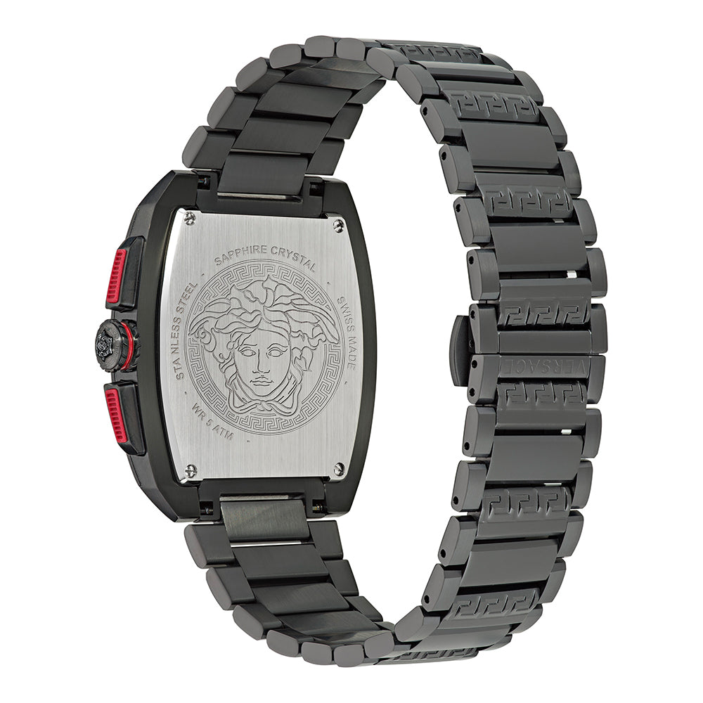 Following the latest trends, the collection embodies the Versace DNA in this bold tonneau case body. The watch hosts a chrono movement with 3 counters. To flag the silicon strap version where the Versace logo meets the Greca creating a new masculine and eye-catching pattern.
