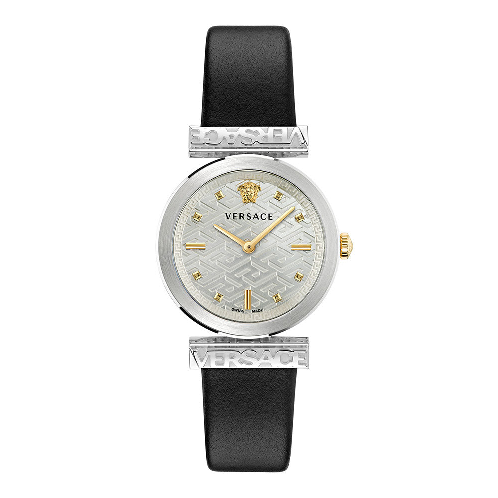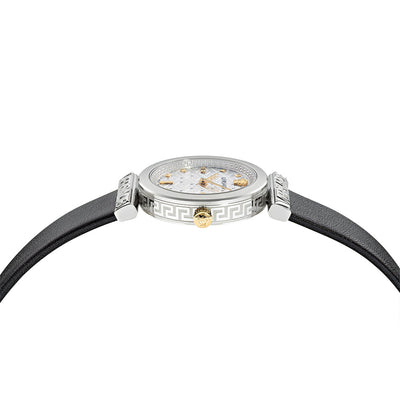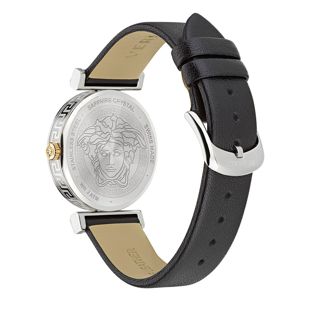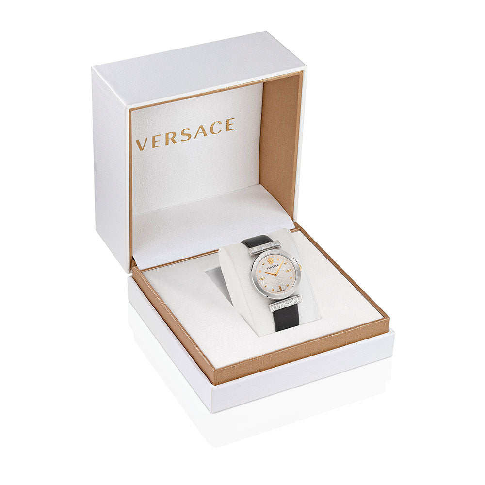 The Versace Regalia is a refined timepiece characterized by a recognizable Versace logo on the lugs framing the dial. The dial is enriched with a 3D Medusa at 12H and the celebrated 3D la Greca pattern.