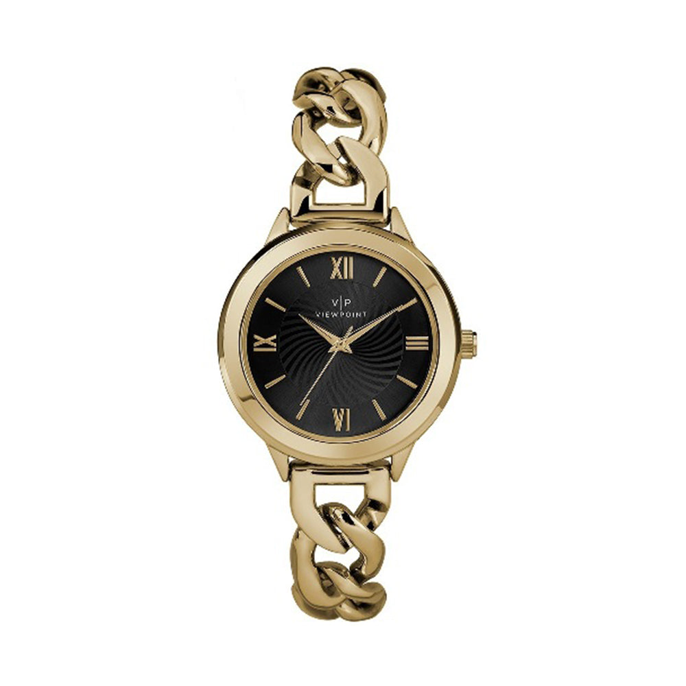 Accessorize your outfit with this elegant Viewpoint by Timex watch featuring a gold-tone case and chain bracelet with a detailed black dial. The gold-tone Roman numerals and hour markers offer a truly timeless look.