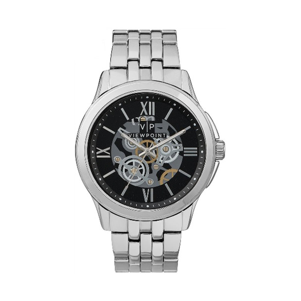 Timeless and sophisticated, this Viewpoint by Timex watch is great for everyday use and features a silver-tone case and bracelet and a partial Roman numeral black detailed dial for a classic look.