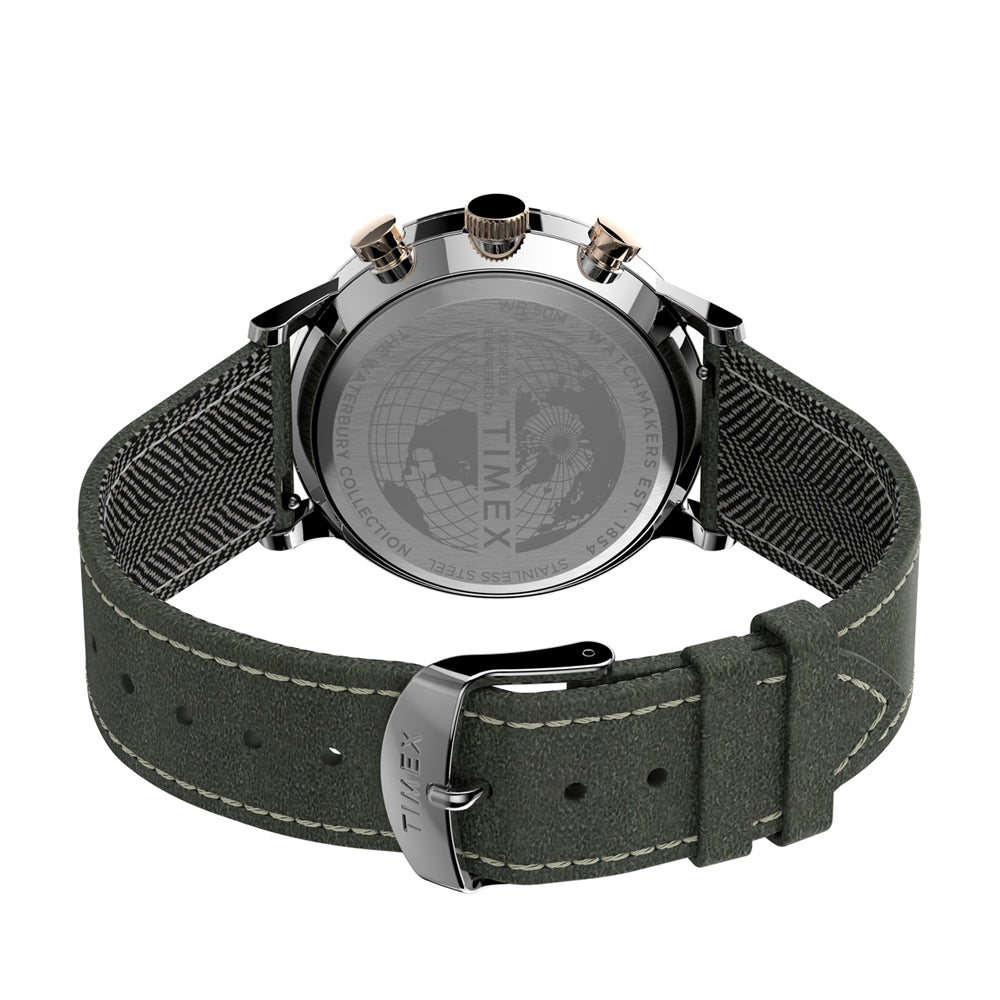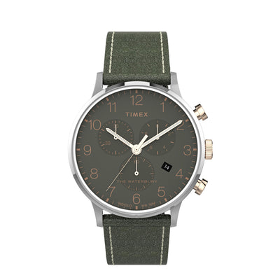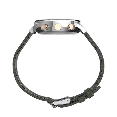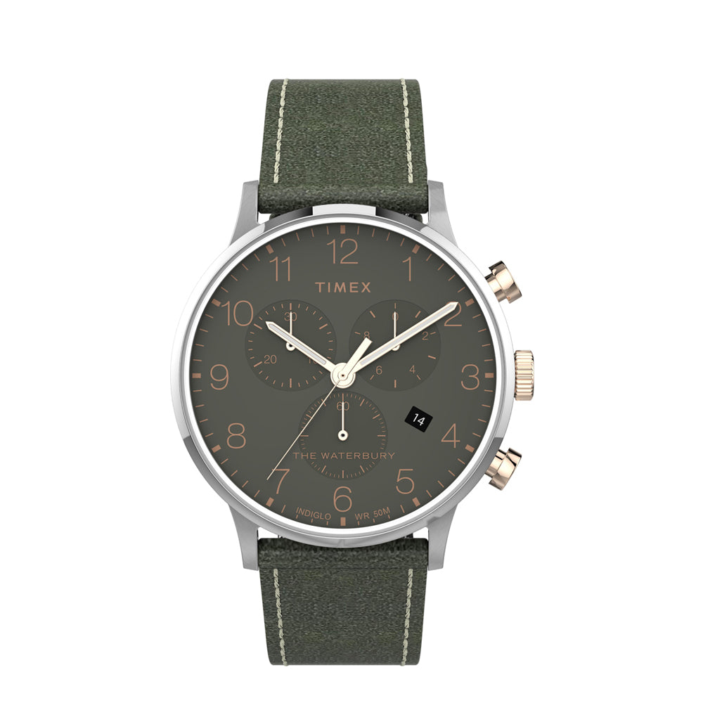 There is strength in tradition. This collection is an update to a true classic — a timepiece honoring our roots with ageless style. A testament to our commitment to craftsmanship and watchmaking, the Waterbury Classic Chronograph is well-suited for everyday wear with its stainless steel case with rose gold-tone accents, green dial and green leather strap with tweed fabric lining and quick-release spring bars.