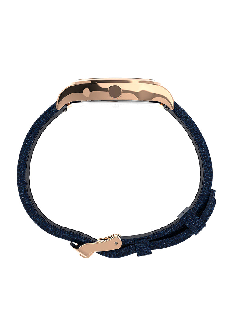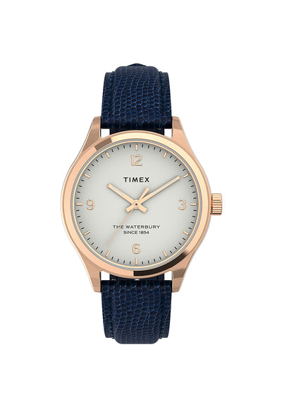 There is strength in tradition. An update to a true classic, this timepiece honors our roots with ageless style. Our Waterbury Traditional embodies our commitment to craftsmanship and refined watchmaking, and is well-suited for everyday wear with its white dial, polished rose gold-tone stainless-steel case and a natural navy lizard-patterned leather strap.