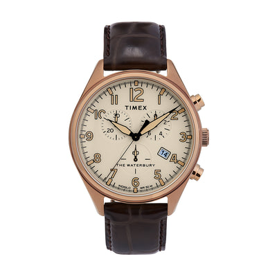 There is strength in tradition. The Waterbury Traditional Chronograph is an update to a true classic — a timepiece honoring our roots with ageless style. A testament to our commitment to craftsmanship and watchmaking, this chronograph watch is well-suited for everyday wear with its gold-tone stainless steel case, tan dial and brown leather strap.