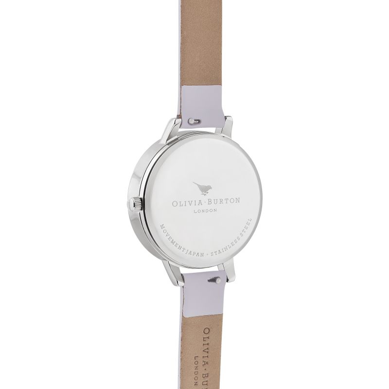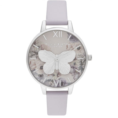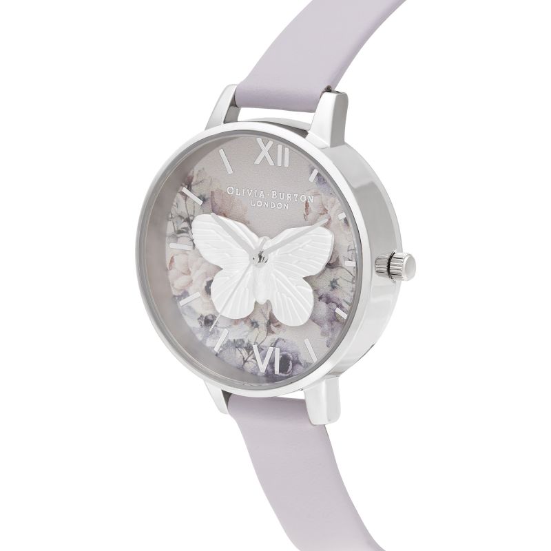 The floral blooms in pastel tones are layered under the butterfly motif. A pretty summer feel with this elegant timepiece.