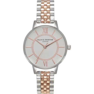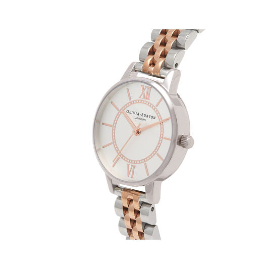 Eternally chic this beautiful two colour bracelet watch will add a vintage spirit with a fashionable edge to your look. The classic design boasts a white dial with a luxe silver and rose gold palette, a versatile choice for your everyday wardrobe.