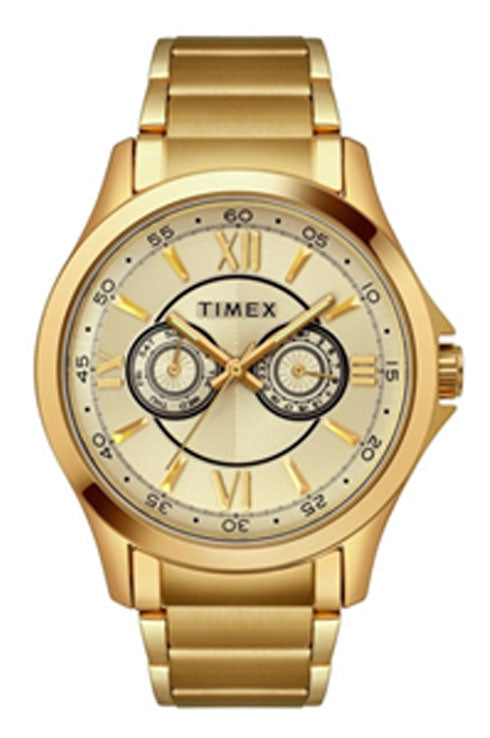 A new addition to your premium repertoire of timepieces, this men's analog watch from Timex is a must-have wrist essential. The stainless steel strap exudes a golden hue that accentuates the look of the timekeeper. Encased in a 43 mm case, the round dial is protected by a mineral glass. It features plain three hands, Roman numerals at quarter intervals, bold stick indices for rest of the hours, two subdials and a crown for time adjustment.