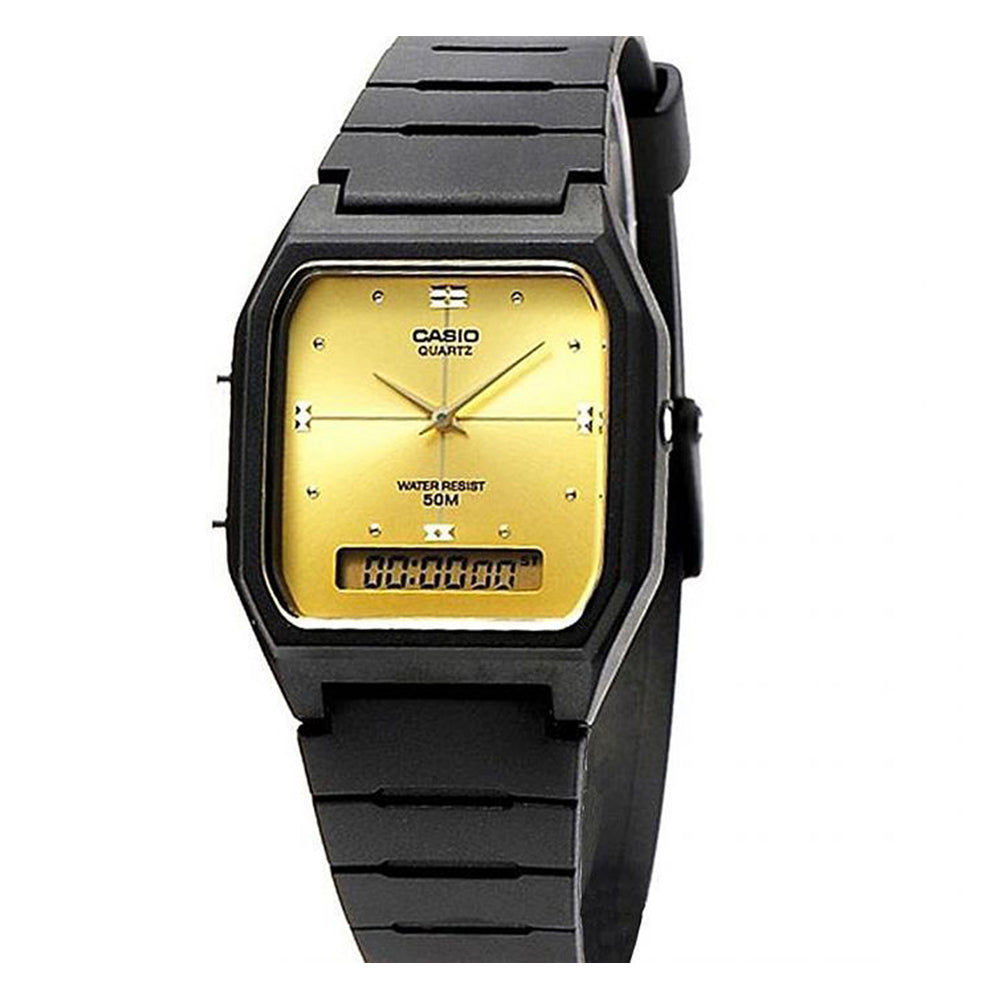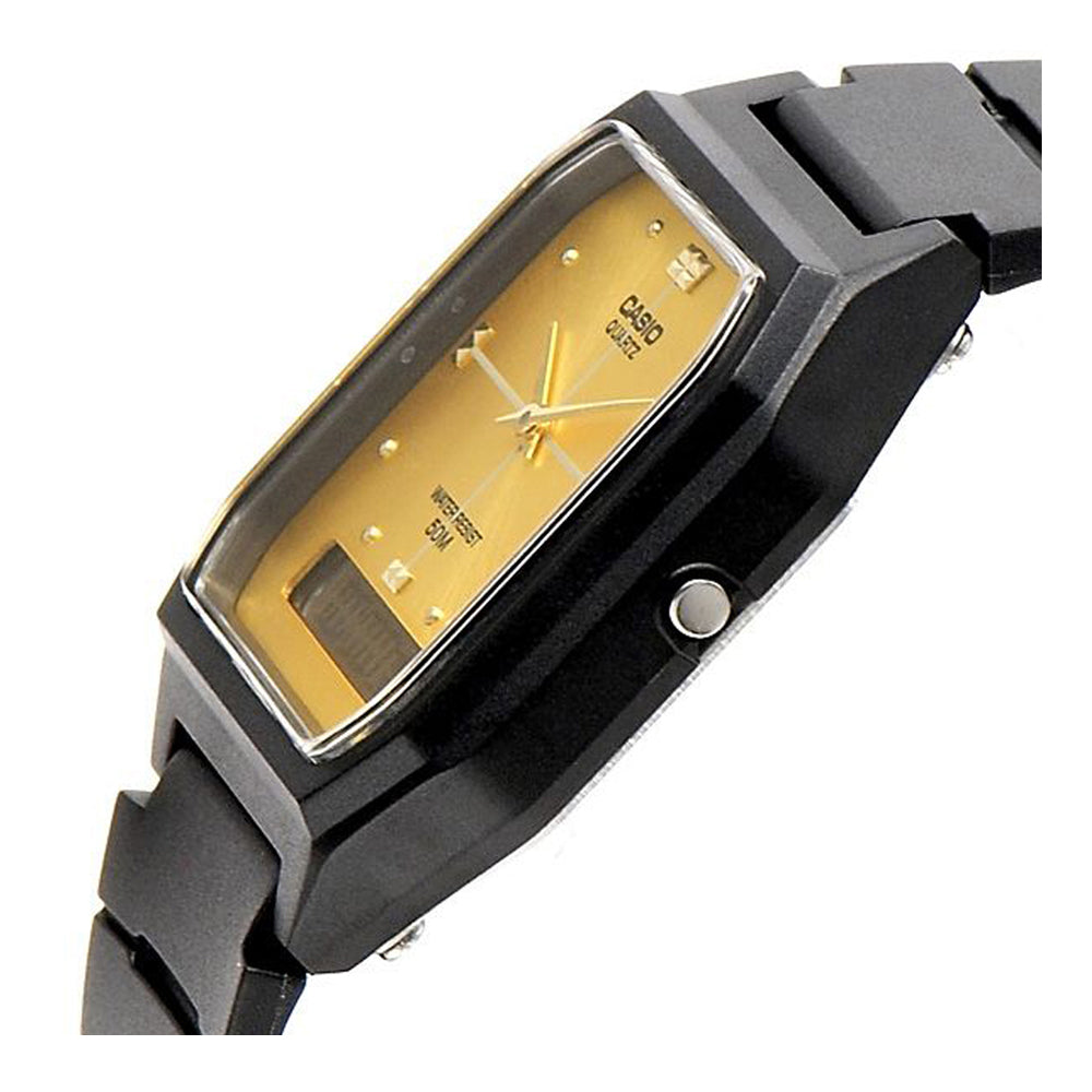 The timeless style of an analog watch, combined with the functionality of a digital watch. This ana-digi combination allows you to see up to 2 times or the date with day of the week. With the added features of an alarm, stopwatch and hourly time signal, you’ll never lose track of time. Gold Casual Classic Watch with Analog and Digital Timekeeping.