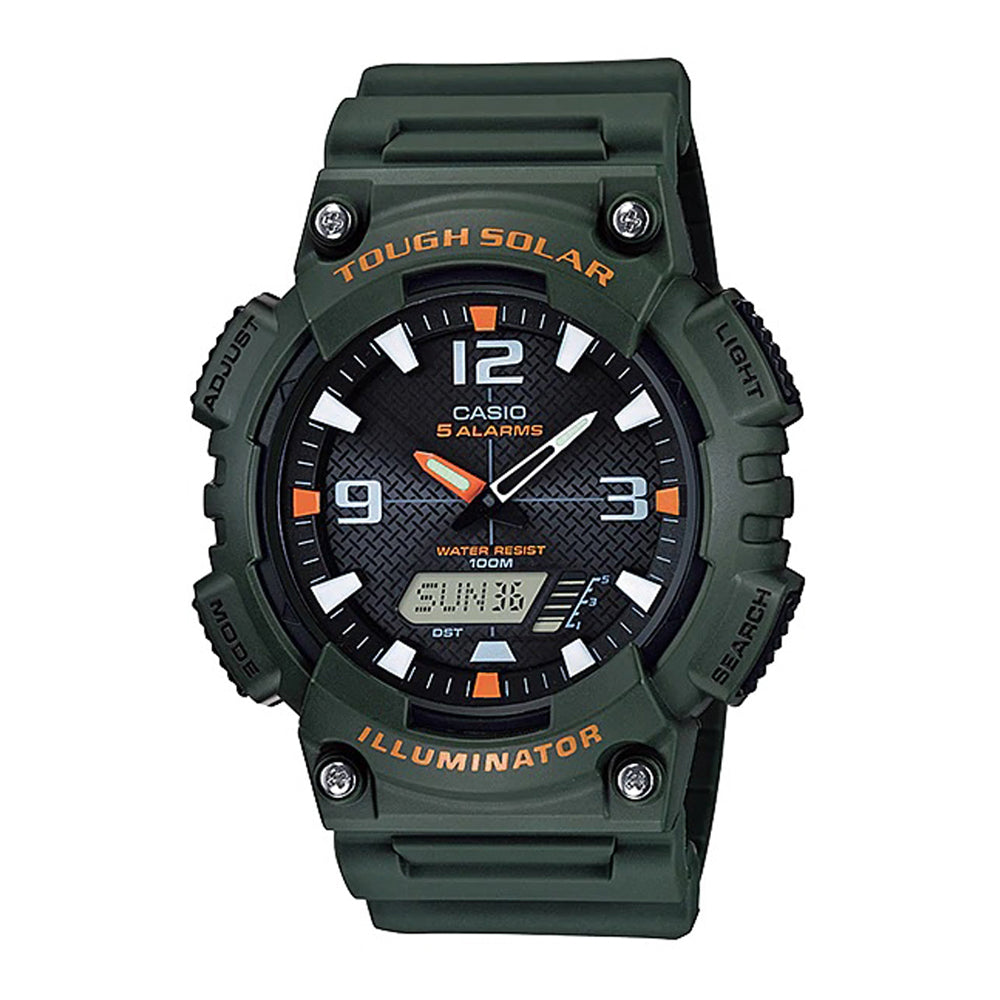 Utilizing a unique Self-Charging solar power system, this sporty analog/digital combination model provides plenty of functionality. A host of features such as 48-city world time, 5 alarms, stopwatch and dual countdown timers make this a versatile timepiece for almost any sport outing. Green resin band, solar digital analog watch with black & orange face.