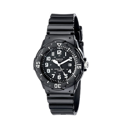 Simple and compact, these dive inspired ladies 3-hand analog timepieces feature 100M water resistance, a bi-directional rotating bezel and date display. Available with hour numerals or markers. Gloss black resin band analog watch with black face.